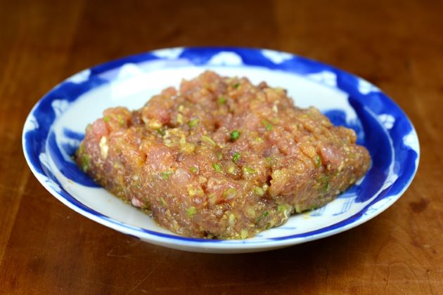 イソマグロのなめろう 中骨に残った身や刺身にしたときに余った部分を集めて置く。細かく切り、みそ・ねぎ・ショウガの搾り汁と一緒によく切れる包丁でたたく。魚のうま味と薬味、みその味が一緒になり、あっさりとした中にうま味豊かだ。酒の肴としては最上級である。クリックで閉じます![]()