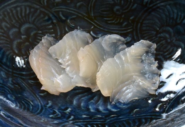 イソモンガラの刺身 鱗が硬くとても下ろしにくい。頭部を落として皮を剥く。三枚に下ろし、薄皮を引くと、白身で血合いがよわく見た目にもとてもきれいな刺身になる。身はやや柔らかいがほんのり甘味があり、捨てがたい味わい。