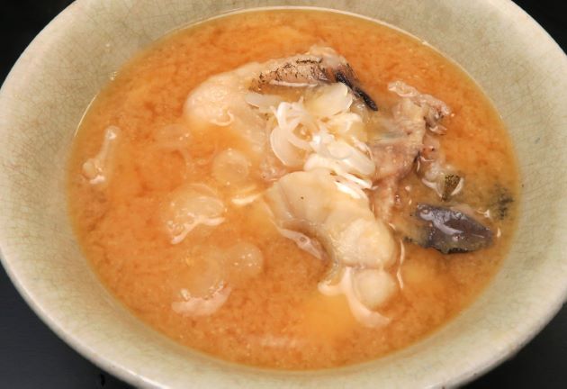 イタチウオのみそ汁 小振りのイタチウオを水洗いして、ぶつ切りにする。これを昆布だし(水でも可)で煮だしてみそを溶く。あまりうま味のあるだしは出ないが、昆布だしを使うこと、みそを使うことで補う。イヤミのない味のみそ汁になる。クリックで閉じます![]()