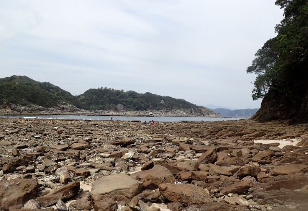 岩礁域の間の砂礫の中にいるので、海水を持ち帰り、砂抜きをする。