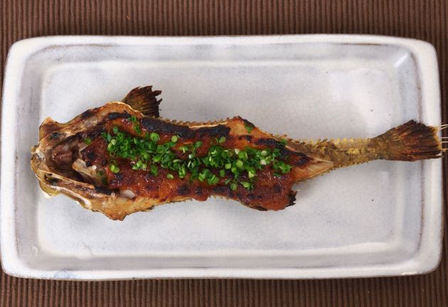 イヌゴチのみそ焼き 水洗いして背割りにする。内臓を取り出し、肝を取り分けて置く。開いた身を素焼きにして最後に、肝とみそ、みりん、酒などを合わせたものを乗せて焼き上げる。あまり食べ出があるとは言えないが、手間を惜しまず食べて美味。クリックで閉じます![]()