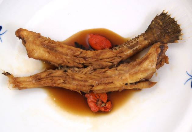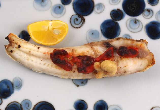 イヌゴチの塩焼き 水洗いして卵巣、肝を分けておく。三枚に下ろして塩を振り1時間程度寝かせて、肝と卵巣を乗せて焼く。焼くとかなりしまり、見た目はやせてよくないが、味はなかなかのもの。おかずというよりも、佳肴といったもので、酒が進むこと間違いなし。クリックで閉じます![]()