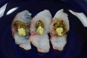 イバラヒゲの刺身肝のせ 今回の3月の個体で残念だったのは肝が小さかったこと。食した個体数が少ないので、肝の太る旬がわからない。これは課題。ただし肝は美味ではある。肝をゆでてしょうゆと合わせて叩く。これを薄めに切りつけた身にのせて食べる。淡泊で上品な味わいに、肝のうま味がプラスされて美味。クリックで閉じます![]()