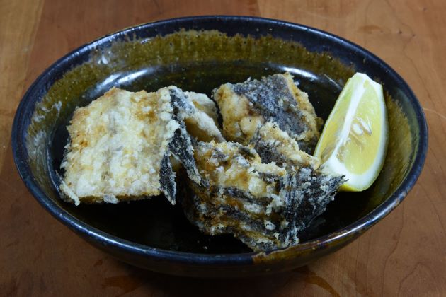 イバラヒゲの唐揚げ 頭部が大きく尾の部分がほっそりとしている。この使いにくい尾の部分は唐揚げにするのがいちばん手っ取り早い。二枚に下ろして片栗粉をまぶして二度揚げ。骨までさくっとして香ばしい。クリックで閉じます![]()