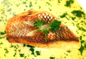 イラのポワレ ベラ亜目のベラ科、ブダイ科は火を通すと溶けたり、煮崩れる皮であることが多いが、イラは比較的強い。上品な白身でソテーすることで味わいが増すのでポワレは非常にいい。皮目は香ばしく、なかはしっとりと揚がる。クリックで閉じます![]()