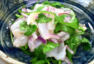 イラのセビチェ 淡泊で嫌みのない身質ながら、単に刺身にするともの足りないと思うかも。これを柑橘類と青唐辛子、香りのある野菜で補う。皮を引きやや小さめに切る。ライム(柑橘類ならなんでもいい)と塩でマリネ。少し寝かせたら紫玉ねぎ(ただの玉ねぎでもいい)、香りのある青み(トマトもいい)で和える。テキーラなどスピリッツが合う。クリックで閉じます![]()
