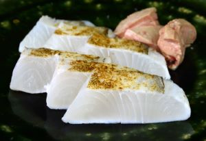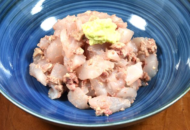ウスバハギの肝和え(きもたたき) 寒い時季のウスバハギは肝が太っている。うま味が充満している。これを湯通し、冷水に落として水分をきる。三枚に下ろして腹骨・血合い骨をとり、やや細かく切る。これをゆでた肝と和える。クリックで閉じます![]()