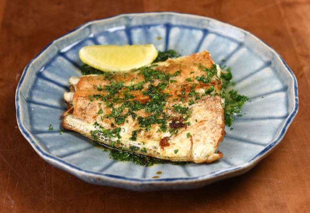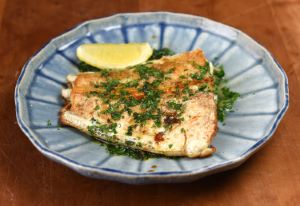 ウスバハギのムニエル(バター焼き) 旬は秋から冬である。年間を通してとれる魚だが、旬を外れるとややさっぱり上品すぎてもの足りない。このようなときはムニエル、バター焼きにするといい。切り身にして塩コショウし、小麦粉をまぶしてこんがりと大目の油でソテー。余分な油を捨て(油のストッカーに保存して再利用して欲しい)、仕上げにたっぷりのバターで風味づけし醤油を振る。クリックで閉じます![]()