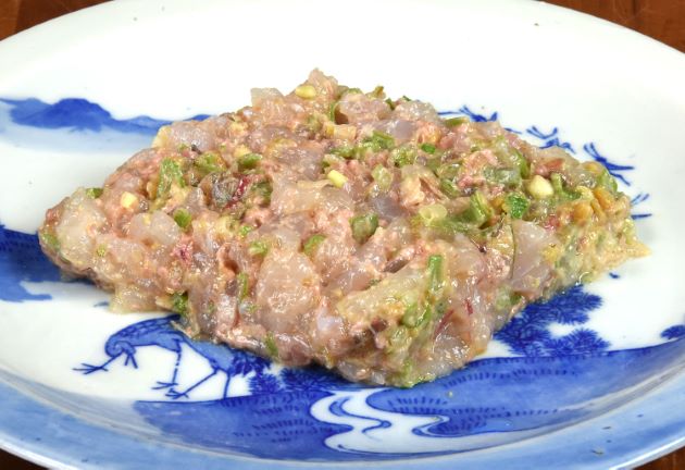 ウスバハギのなめろう(みそたたき) 筋肉は上品で淡泊な味わい。見た目にも単調である。これを肝・みそ・青じそなど香り野ある野菜、ショウガなどと一緒にたたく。みそと肝の相性がよくうま味豊かで、飽きの来ない味わい。ご飯にのせて茶漬けにしてもいい。クリックで閉じます![]()