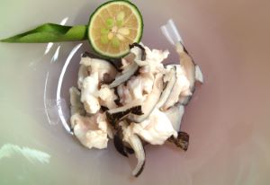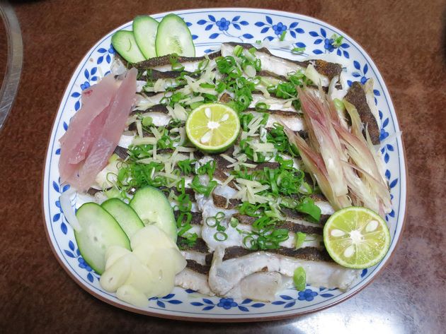 ウツボのたたき ウツボを三枚に下ろして皮目をあぶり、骨抜きをして、薄く切る。骨は冷めてから抜く方がやりやすい。好みの野菜とポン酢で食べるが、ゼラチン質の皮の食感がよく呈味性分からの甘みを感じる。一度食べたら病みつきになるうまさだと思う。