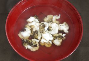 ウツボの湯引き 三枚に下ろして、薄くそぎ切りにして熱湯にくぐらせ冷水に落とし、水を切ったたもの。ポン酢、酢みそで食べる。やはり皮目は抜群にうまい。ぷるんとした食感の皮に筋肉の軟らかさの対比が楽しい。クリックで閉じます![]()