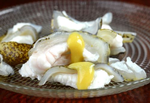 身は上品な白身で、身の中に脂が混在している。そのため白濁している。