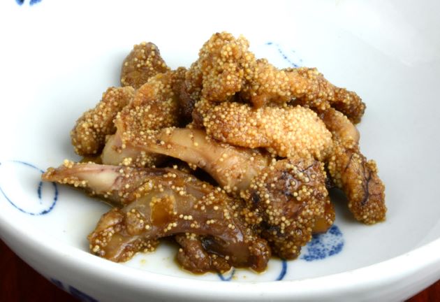 ウルメイワシの真子煮 春になると子持ちが増えてくる。まとまった量を下ろすときや干物を作るときには真子は取り分けておく。真子の汚れを塩水などの中で洗う。水分をよくきっておく。鍋に砂糖・酒・醤油を煮立てておく。濃度をみて水を加えてもいい。真子を入れて煮汁に絡めながら煮上げる。クリックで閉じます![]()