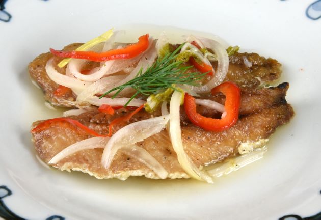 ウルメイワシのエスカベーシュ(エスカベッシュ) 水洗いして手開きにして左右の身を分ける。水分をよくきり、小麦粉をまぶしてじっくり香ばしく上げる。これをマリネ液(ワインビネガー・白ワイン・少量の水・ハーブブイヨンを合わせて一煮立ちさせたもの)、玉ねぎやにんじん、ハーブなどに1日以上漬け込む。クリックで閉じます![]()