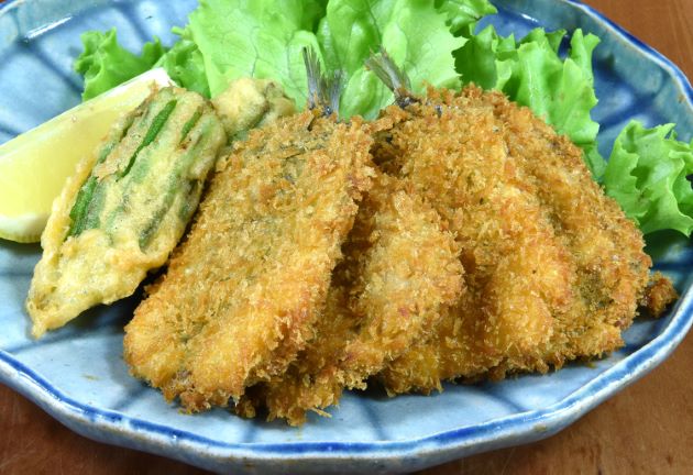 ウルメイワシのフライ 水洗いして頭部を落とし、手開きにする。腹骨・小骨を適当に取り、塩コショウする。小麦粉をまぶして、溶き卵をくぐらせてパン粉をつけて揚げる。身は柔らかくさくっと揚がってとても美味しい。アジフライに、決してひけを取らないおいしさだ。