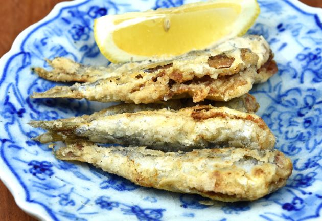 小ウルメの唐揚げ 小振りのウルメイワシは水分が多く、骨が柔らかいのでとても唐揚げに向いている。水洗いして頭部を落とす。水分をよくきり片栗粉をまぶして少し置く。片栗粉が馴染んだらじっくりと二度揚げする。非常に軽い味でさくさくと食べられる。スナック菓子のようでもある。クリックで閉じます![]()