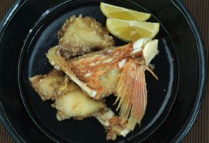エビスダイの唐揚げ 歩留まりの悪い魚なので刺身などにしたときの端や胸鰭しゅうへん、中骨などを集めて置き、片栗粉をまぶしてじっくり二度揚げする。表面はとても香ばしく風味がいい。身は硬く締まり、鶏肉を思わせて味わい深い。