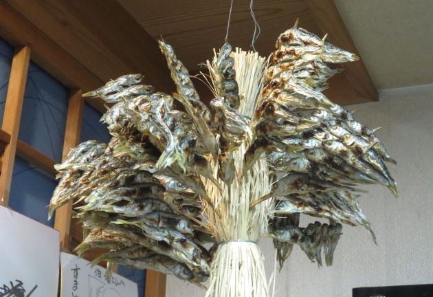 鮠(はえ)の焼き干し 秋から初冬にかけてとった「はえ」を串に刺し素焼きにしたもの。藁を束ねたものに刺して保存する。強く乾くことで保存性が増し、これを唐揚げにしたり、煮たり、だしにしたりする。[岡山県新見市] 協力/伯備(岡山県新見市)クリックで閉じます![]()