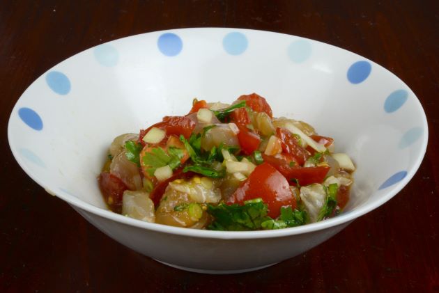 オオアオノメアラのポケ(ポキ) 三枚に下ろして刺身にすると、どうしても端の部分や中途半端な部分が出てしまう。これを有効に使うにはマリネするのがいちばんいい。ハワイなど熱帯域のポキ、南米のセビチェなど。ここでは端の部分を小さく切り、トマト、玉ねぎ、ねぎなど香りのある野菜と合わせてしょうゆ、ごま油で和えたもの。クリックで閉じます![]()