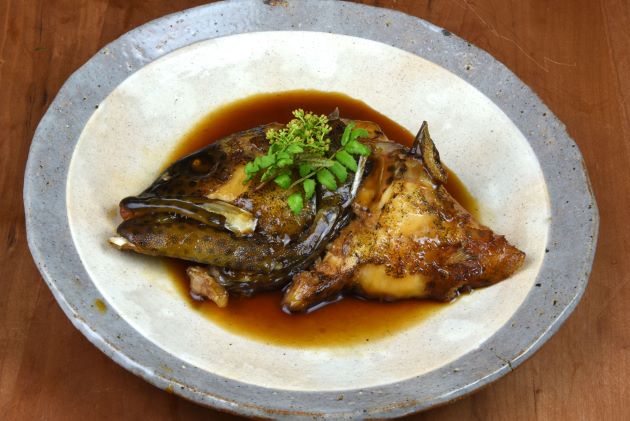 オオアオノメアラの兜煮(煮つけ) 頭部を梨子割りにして湯通しして冷水に落とし、ていねいに鱗を流す。水分をよくきり、酒・砂糖・しょうゆ味で煮上げたもの。あっさりと酒・しょうゆだけでもいいし、塩煮もいい。身に甘みがあり、皮がねっとりしてうまい。クリックで閉じます![]()