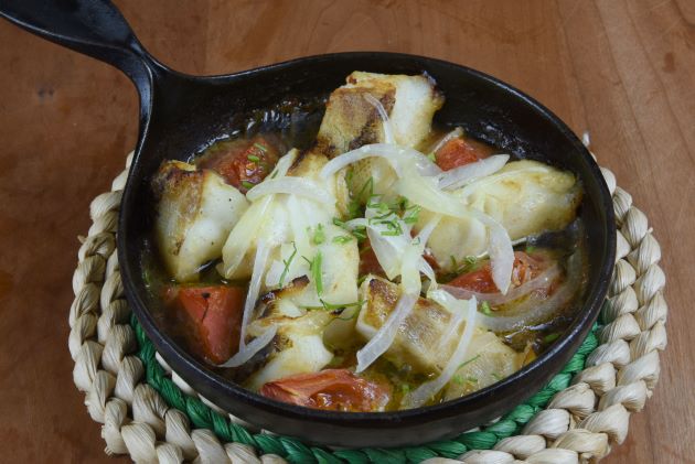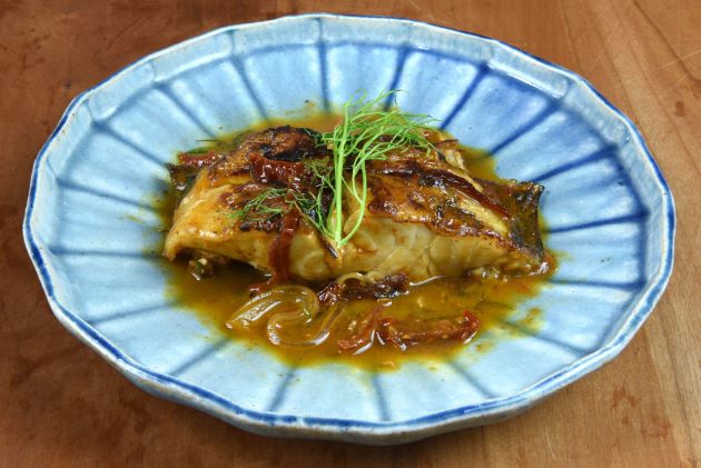 オオアオノメアラのアクアパッツァ 骨つきの切り身に塩コショウして、多めのオリーブオイルで炒めながら白ワインをかけ回す。ここでは白ワインとアンチョビペーストを使い、ドライトマト、玉ねぎなどの野菜を使った。クリックで閉じます![]()