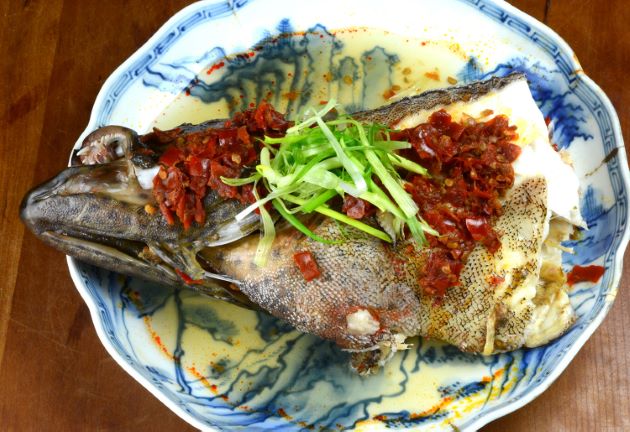 オオアオノメアラの清蒸 切り身に振り塩をして水分が出てきたら拭き取る。これをねぎ、しょうがなどを乗せて蒸し上げる。蒸し上がったら中国しょうゆ・少量の魚醬・紹興酒、蒸したとき皿に溜まった汁を合わせて少し煮つめてかける。そこに香菜、ねぎなどを乗せて煙がでるほど熱した油をかける。
