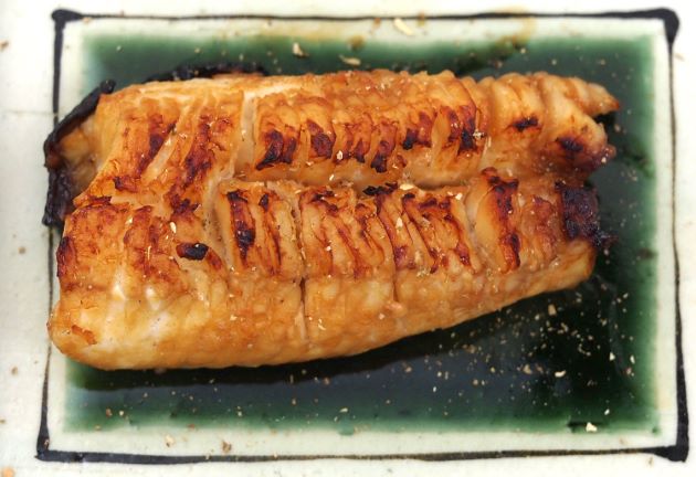 オオカミウオ皮の幽庵焼き 水洗いして三枚に下ろす。切り身にして水分をよくきる。これを酒・醤油・みりん同割り(比率は斯のみで)の地につけ込む。最低でも半日はつけ込みたい。山椒や柚子の香りをつけてもいい。淡泊な味わいに発酵調味料が合わさり、味に奥行きが出る。非常にうまい。クリックで閉じます![]()