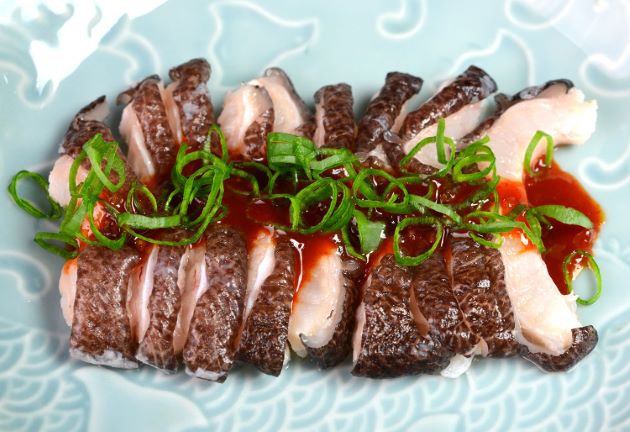 オオカミウオ腹身の湯引き 水洗いして三枚に下ろすとき、腹の部分を別に切り取る。水分をよく拭き取り、湯通しする。湯に塩を加える必要はない。冷水に落としてぬめりをこそげ取る。これを食べやすい大きさに切る。このまま醤油で食べてもぷりぷりした食感と皮のうま味、身のうま味でとても味わい深い。コチュジャン酢、酢みそで食べてもいい。クリックで閉じます![]()