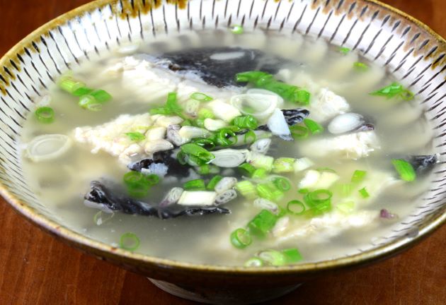 オオカミウオ皮の潮汁 下ろして中骨、刺身に引いたときの皮などを集めて置く。皮はできるだけ多い方がおいしい。湯通しして冷水に落としぬめりなどをていねいに取る。水分をよくきり、昆布だしで煮だして酒・塩で味つけする。塩味だけのあっさりした味つけではあるがうま味豊かでこくがある。クリックで閉じます![]()