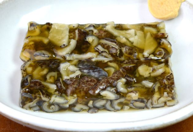 オオカミウオ皮の煮凝り 厚みがある皮は煮ると柔らかくなり、コロイド状に溶け出してくるものがある。皮を湯通しして表面のぬめり、残った身などをこそげ落とす。細かく切り、酒・砂糖・醤油・少量の水で煮る。煮たら鍋止めして冷まし、形に入れて冷やす。ほどよく固まり、実にうまい煮凝りになる。クリックで閉じます![]()