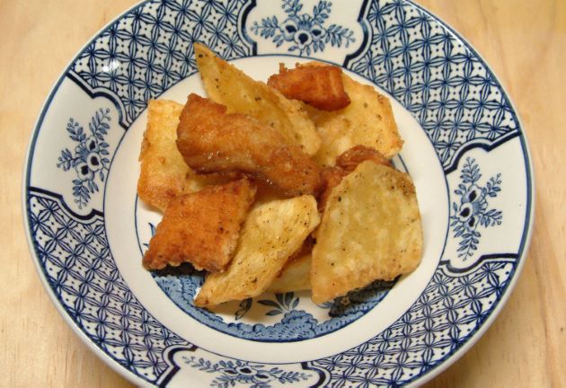 オオカミウオのフィッシュ&チップス 水洗いして三枚に下ろし皮を引く。切り身は食べやすい大きさに切る。小麦粉をまぶし衣(小麦粉・ビール・少量の油・水)をつけて揚げる。このとき一緒に小麦粉をまぶしたジャガイモも揚げる。モルトビネガーがあれば振って食べるとうまい。クリックで閉じます![]()