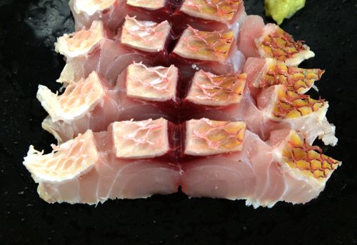 オオクチハマダイの皮霜造 水洗いして三枚に下ろし血合い骨・腹骨を取る。皮目に湯をかけて刺身状に切る。皮に豊かなうま味があるがやや硬い。身に脂とうま味成分からくる甘みがあり、味に奥行きがある。非常に美味。クリックで閉じます![]()