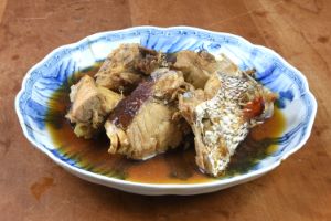 オオグチイシチビキの煮つけ 頭部近くやかま下など冊にならない部分を使って煮つけにする。非常にあっさりとして上品な味わいで嫌みがない。あらなどは適当に切り、湯通しする。冷水に落としてぬめりや残った鱗を流す。水分をよくきり酒・みりん・醤油・水で煮る。クリックで閉じます![]()