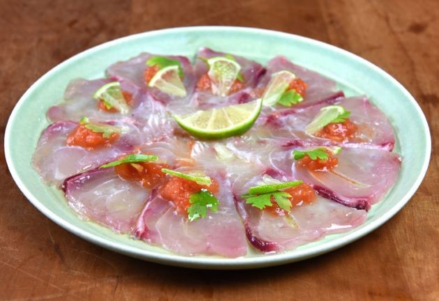 オオグチイシチビキのカルパッチョ ハチビキと比べると赤みが弱く、やや水分が多い。うま味も強いとは思えないので、ここではカルパッチョにした。三枚に下ろして皮を引く。できるだけ薄く切りつけて置く。皿にニンニクをなすりつけ、オリーブオイルをたらす。振り塩をして切りつけた身を並べて行く。上に好みの野菜、塩をしてオリーブオイルをたらす。コショウや辛い唐辛子、白チャーズソースなどを使ってもいい。