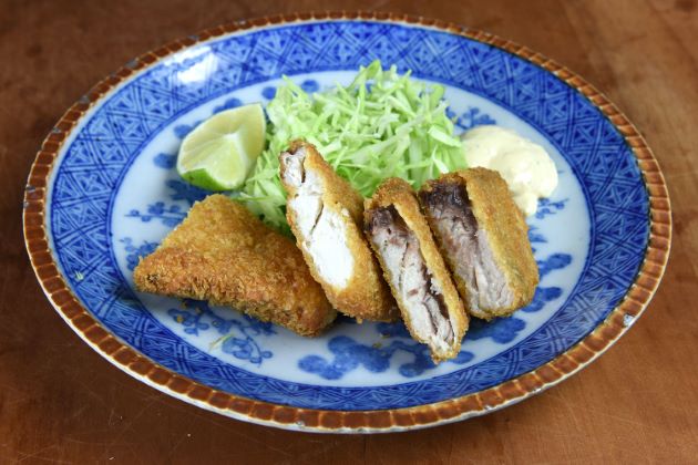 オオグチイシチビキのフライ もっとも万人向きの料理だと思っている。旬を外れていたら、揚げると脂のなさがリカバリーできる。水洗いして三枚に下ろし、中骨・腹骨を取る。ここでは皮を引いて切り身にした。切り身に塩コショウして小麦粉をまぶし、溶き卵にくぐらせ、パン粉をつけて揚げる。クリックで閉じます![]()