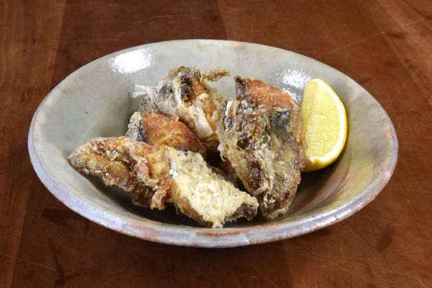 オオグチイシチビキの唐揚げ かまの部分や切り落とし、腹の薄い部分を集めておく。片栗粉をまぶして二度揚げする。揚げ上がりに塩をふる。カイエンヌペッパーやコショウで香りづけするとなおおいしい。身はふっくらと皮や鰭はさくさくと香ばしく上がる。クリックで閉じます![]()