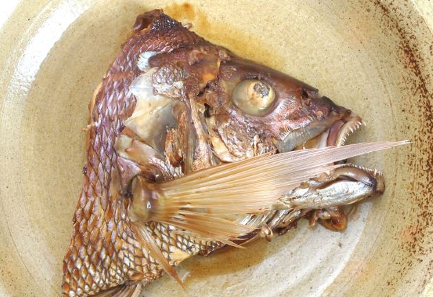 オオヒメのの兜煮(煮つけ) ここでは兜をつかったが、あらでも切り身でもいい。兜は梨子割りにして湯通しして冷水に落として残った鱗やぬめりを流す。水分をよくきり、水・酒・醤油で煮る。砂糖、みりんを加えてもいい。皮は柔らかく身離れがいい。身にうま味成分から来る甘味が感じられる。クリックで閉じます![]()