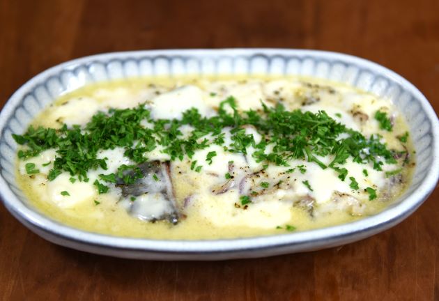 オキアジのホワイトソース煮 こんがりソテーしたオキアジの切り身をホワイトソースで煮込んだもの。ホワイトソースは牛乳、バター、小麦粉で作る。にんにく風味をつけたオリーブオイルでオキアジの切り身と玉ねぎなどをソテーする。こんがり焦げ目がついたらゆるめに作ったホワイトソースを加えて煮込む。ホワイトソースが硬いときは牛乳を加える。クリックで閉じます![]()