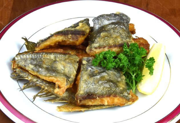 オキアジの唐揚げ 比較的骨の柔らかいアジ科の魚の中でも、もっとも骨が柔らかい。水洗いして骨つきの片身を揚げやすい大きさに切り、水分をよくきる。片栗粉をまぶしてじっくりと二度揚げする。身はとても柔らかく豊潤。肉汁に独特のうま味が感じられる。中骨などすべてが食べられる。クリックで閉じます![]()