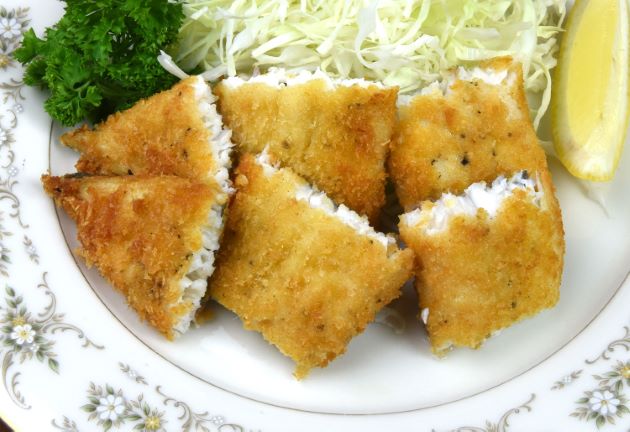 オキアジのフライ 小振りのオキアジを三枚に下ろして腹骨・血合い骨を取り去り、皮つきのまま塩コショウする。小麦粉をまぶして卵黄にくぐらせてパン粉をまぶして揚げる。かりっと香ばしい衣の中には、とても豊潤で甘味の豊かな身があり、実に味わい深い。クリックで閉じます![]()