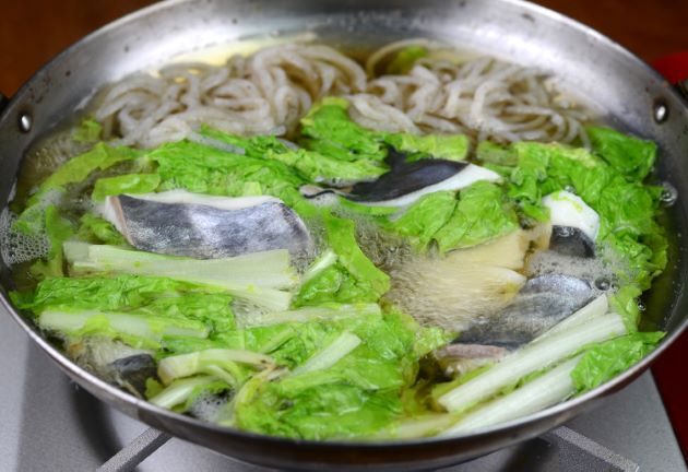 オキアジの割り下鍋(魚すき) 味がついた汁で煮ながら食べる。野菜やコンニャク、しらたき、豆腐などを一緒に食べる。水洗いして適当に切る。割り下(酒・みりん・醤油)と昆布だしを湧かして煮ながら食べる。オキアジの切り身自体に味があり、とてもうま味豊かなだしが味わえる。煮汁と一緒に食べるが、もの足りなければポン酢で食べてもいい。クリックで閉じます![]()