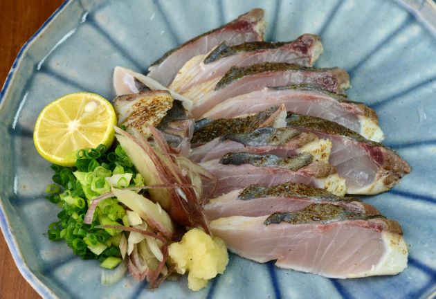 オキアジの焼霜造 科が違ってはいるがマナガツオやサワラと同じように皮に味がある。あぶると香りが立つので、焼霜造りにすることも多い。水洗いして三枚に下ろし、腹骨・血合い骨を取る。写真は大型だったので背と腹に分けた。皮目をあぶって氷水に落とし、水分を皮を破かないように慎重にきる。少し皮目を落ち着かせてから刺身状に切る。皮目のうま味が際立つ。そこに素直な身の甘さが加わると最強クラスの味わいとなる。