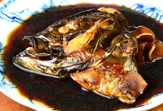 オキアジの兜煮 溜まり醤油を使ってこくのある煮つけにした。見た目は黒いが煮染めていないので、味はあっさりである。水洗いして頭部を梨子割りにする。湯通しして表面のぬめり、鱗などを流す。これを酒・みりん・砂糖・濃口醤油・溜まり醤油で煮る。煮汁が半量程度になったら出来上がりだが、箸で身をほぐすと中は白い。煮汁をからめながら食べる。クリックで閉じます![]()