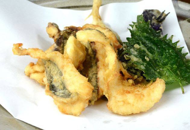 オキアジの天ぷら 後方の部分や腹身の部分を使うといい。三枚に下ろして腹骨・血合い骨を取り、身の薄い部分を縦に切る。小麦粉をまぶし、衣をつけて高温で揚げる。衣はさくっと香ばしく、中は非常に柔らかく噛むと豊潤ですらある。非常においしい。クリックで閉じます![]()