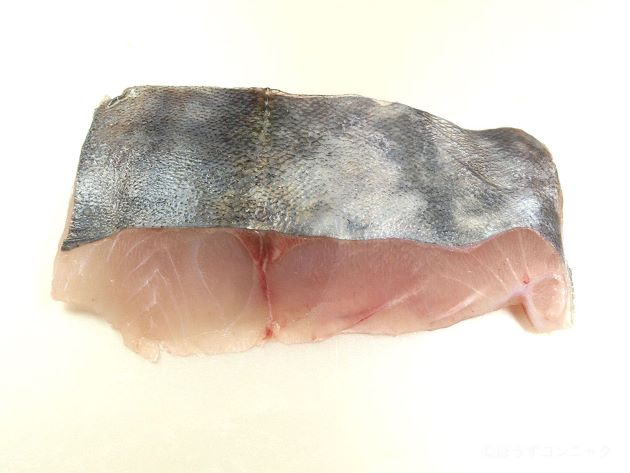 オキアジの煮つけ 二枚に下ろして骨付きの方を二等分して湯をくぐらせる。冷水の落としてあら熱をとり、酒としょうゆで煮上げたもの。甘味を使わない煮つけ方なのでしょうゆは控えめにして、酒を多く使う。煮ても硬く締まらず、身がとてもあまみがあって非常に酒などに合う。ご飯に合わせたい場合にはみりん、砂糖などの甘味をプラスするといい。クリックで閉じますオキアジの煮つけ