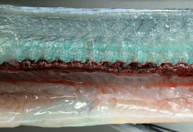 オキザヨリの刺身 水洗いして三枚に下ろし、腹骨をすき取り、青い血合い骨を抜き、刺身にしたもの。頭部に近い方よりも真ん中から後半の方が使いやすい。血合いが赤く、銀皮がある。食感がほどよく、背の青い魚のうま味があり、適度の食感も楽しめる。非常に美味。クリックで閉じますオキザヨリの刺身<