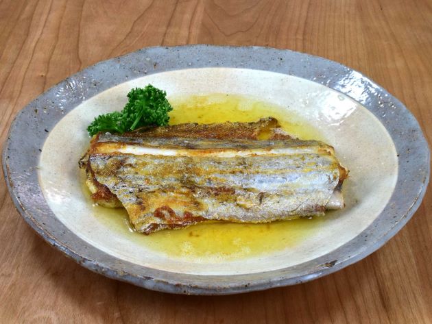 オキナワオオタチのムニエル 本種としては小振り1個体だったので、脂がのっていなかった。ここでは適当に切り、塩コショウして小麦粉をまぶして多めの油でソテーする。仕上げにバター風味をつけた。表面が香ばしく中はふんわり柔らかく出来上がった。バターとの風味もよく美味。