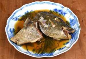 オシャレコショウダイの兜煮(煮つけ) 大型だったので兜だけで煮上げてみた。小型なら適当に切り、煮てもいい。頭部は一度湯通しして冷水に落として残った鱗やぬめりを流す。これを酒・しょうゆ味で煮つけた。みりん、砂糖で甘味を漬けてもいい。煮るとやや硬く締まるが、上品ななかに味わいがある。食べた後にはぜひ「骨湯(医者殺し)」にして欲しい。クリックで閉じます![]()