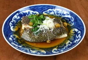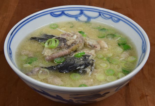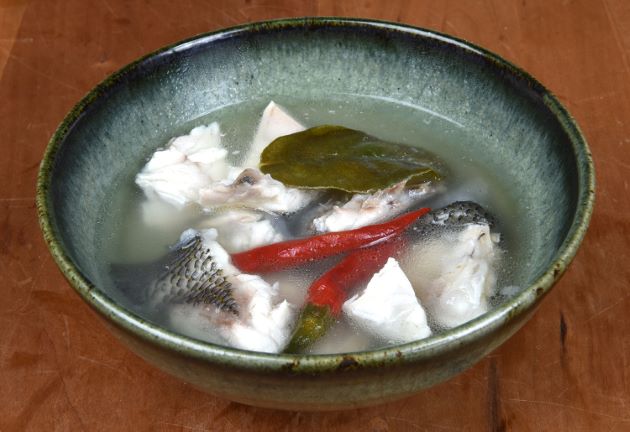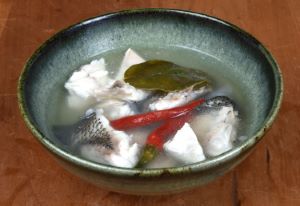 オシャレコショウダイのスープ あらなどを集めて置き、湯通しして冷水に落として残った鱗やぬめりを流す。これを水、少量の紹興酒、コブミカンの葉、粒コショウ、唐辛子とじっくり煮る。仕上げに塩味をつけるとあっさりして癒やしを感じる味。クリックで閉じます![]()