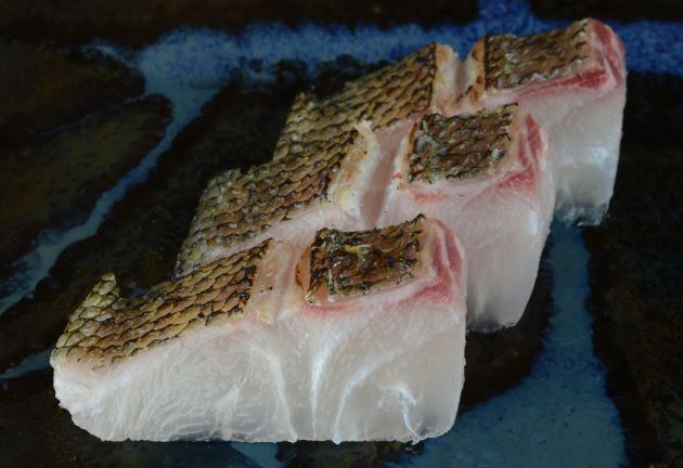 オシャレコショウダイの焼霜造り 皮は厚みがあり硬い。水洗いをして三枚に下ろす。中途半端にあぶると硬いので強めに炙る。氷水に落として粗熱を取り切りつける。寒い時期は身の部分も脂が豊かでうまいが、それ以上に皮が味わい深い。クリックで閉じます![]()